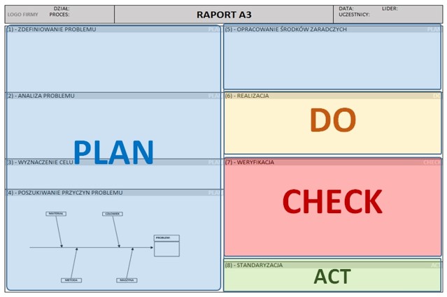 Rozpoczynając pracę z narzędziem A3, powinniśmy w pierwszej kolejności wyznaczyć lidera analizy problemu i zespół wspomagający. Sam arkusz A3 dzieli się na 8 sekcji, które można podzielić na 4 podgrupy, na podstawie wspomnianego już cyklu PDCA. Zgodnie ze schematem:
